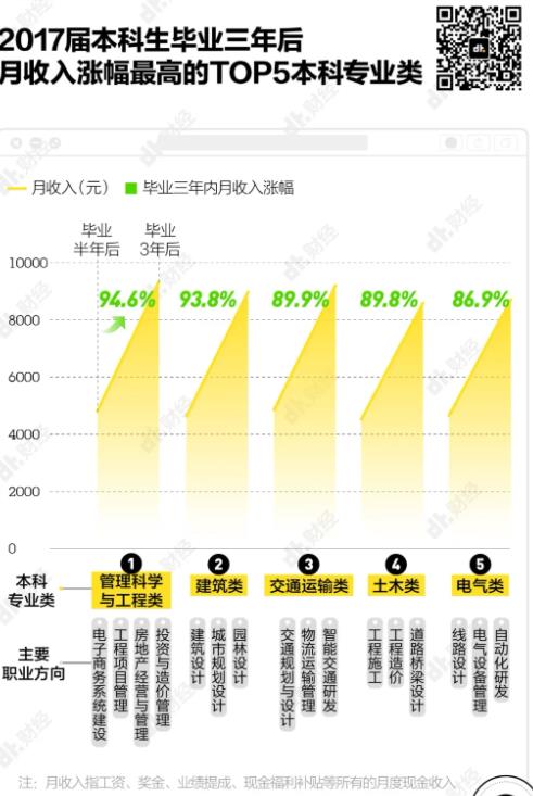 還有建筑、交通運(yùn)輸、土木類專業(yè)等,它們雖然大多屬于傳統(tǒng)行業(yè),起薪低,普遍不如熱門的互聯(lián)網(wǎng)行業(yè)高,但好在收入增幅快、年終獎多。